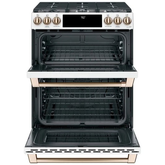 Cafe CCGS750P4MW2 Gas Range, 30 inch Exterior Width, Self Clean, Convection, 6 Burners, 6.7 cu. ft. Capacity, 2 Ovens, Matte White colour True European Convection, Self Clean Racks