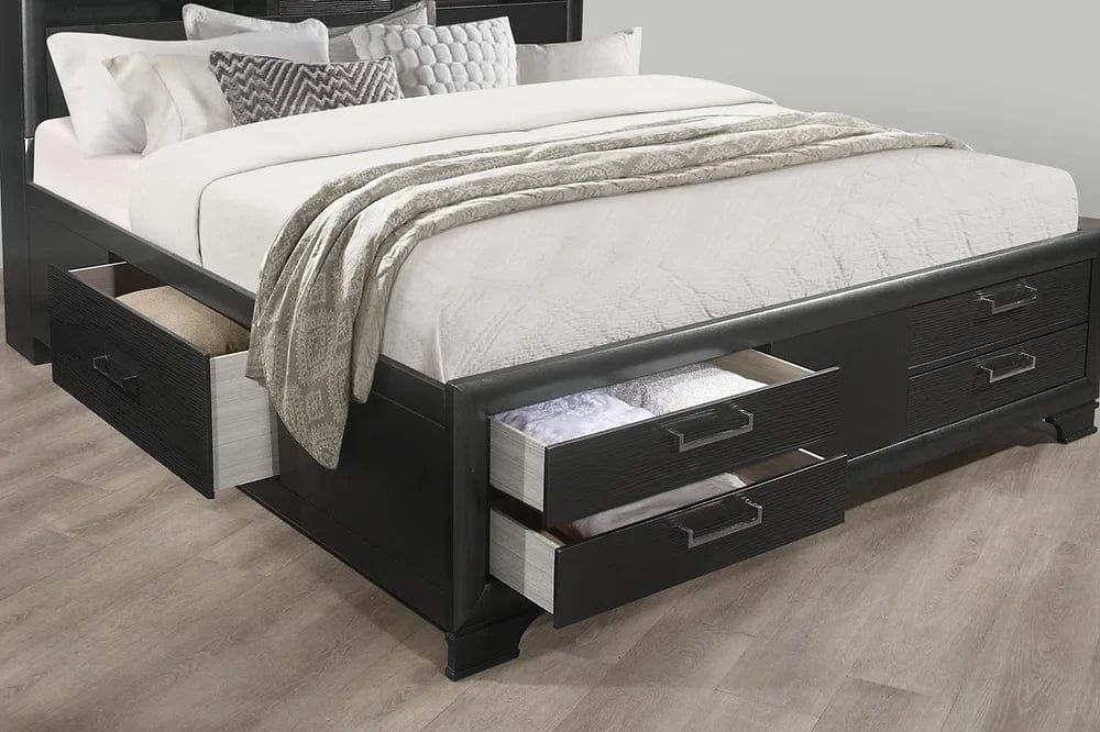 Choose from Double, Queen, or King bed sizes, featuring a storage headboard and under-bed drawers for convenient organization.
