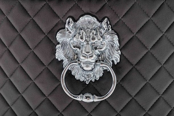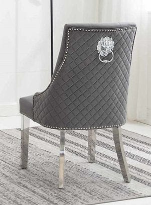 Grey Velvet Dining Chair with Lion Knocker, Polished Chrome Frame, Diamond Studded back and Nail Head Details.