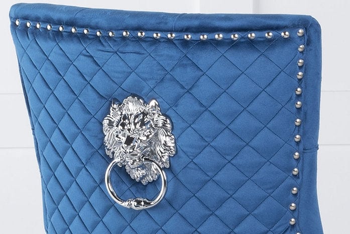 Blue Velvet Dining Chair with Lion Knocker, Polished Chrome Frame, Diamond Studded back and Nail Head Details.