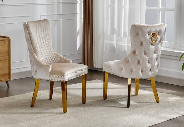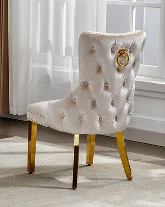 Creme Velvet Dining Chair with Large Knocker, Polished Gold Frame, Deep Tufting back and Nail Head Details.