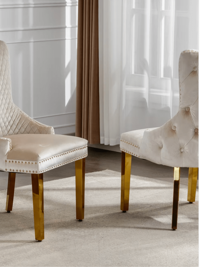 Chairs: Creme Velvet Dining Chair with Large Knocker, Polished Gold Frame, Deep Tufting back and Nail Head Details.