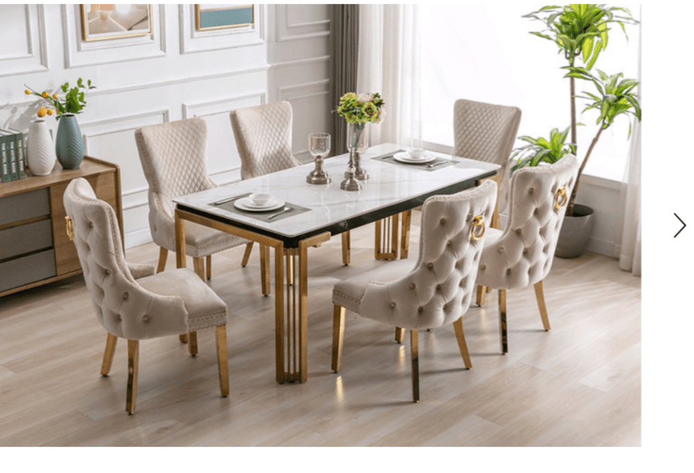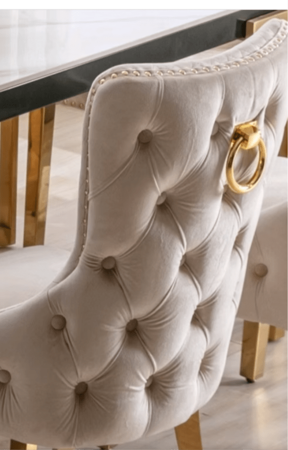 Ceramic Marble Top With Stainless Gold Legs Creme Velvet Dining Chair with Large Knocker,