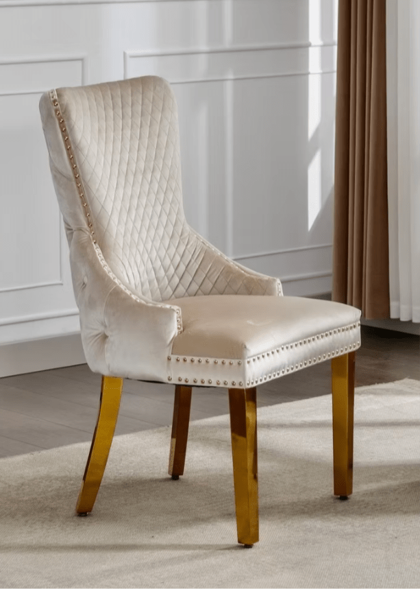 Creme Velvet Dining Chair with Large Knocker, Polished Gold Frame, Deep Tufting back and Nail Head Details.