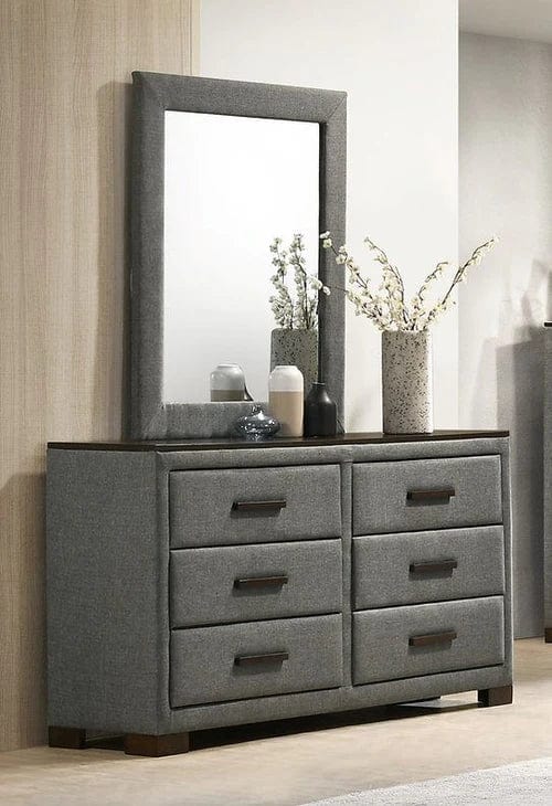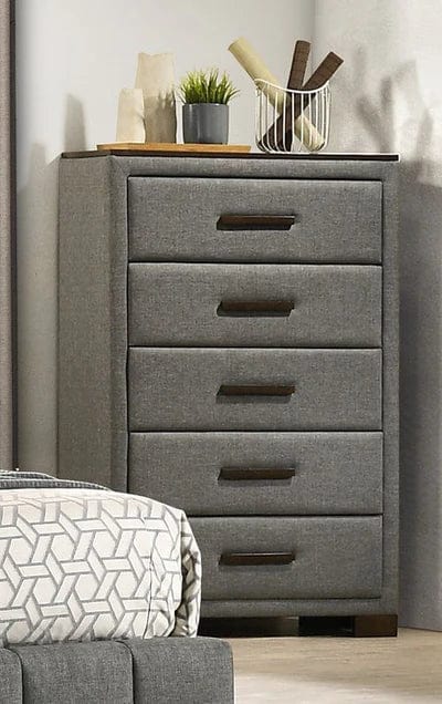 The Dylan Bedroom Collection Dark Grey offers a perfect combination of style and function. This collection is crafted from Tropical Wood MDF and Veneers and features an upholstered vertical pattern headboard in a dark grey fabric with solid rubberwood handles and brown wood accents. Its platform bed design eliminates the need for a box spring, ensuring a beautiful and durable bedroom set.