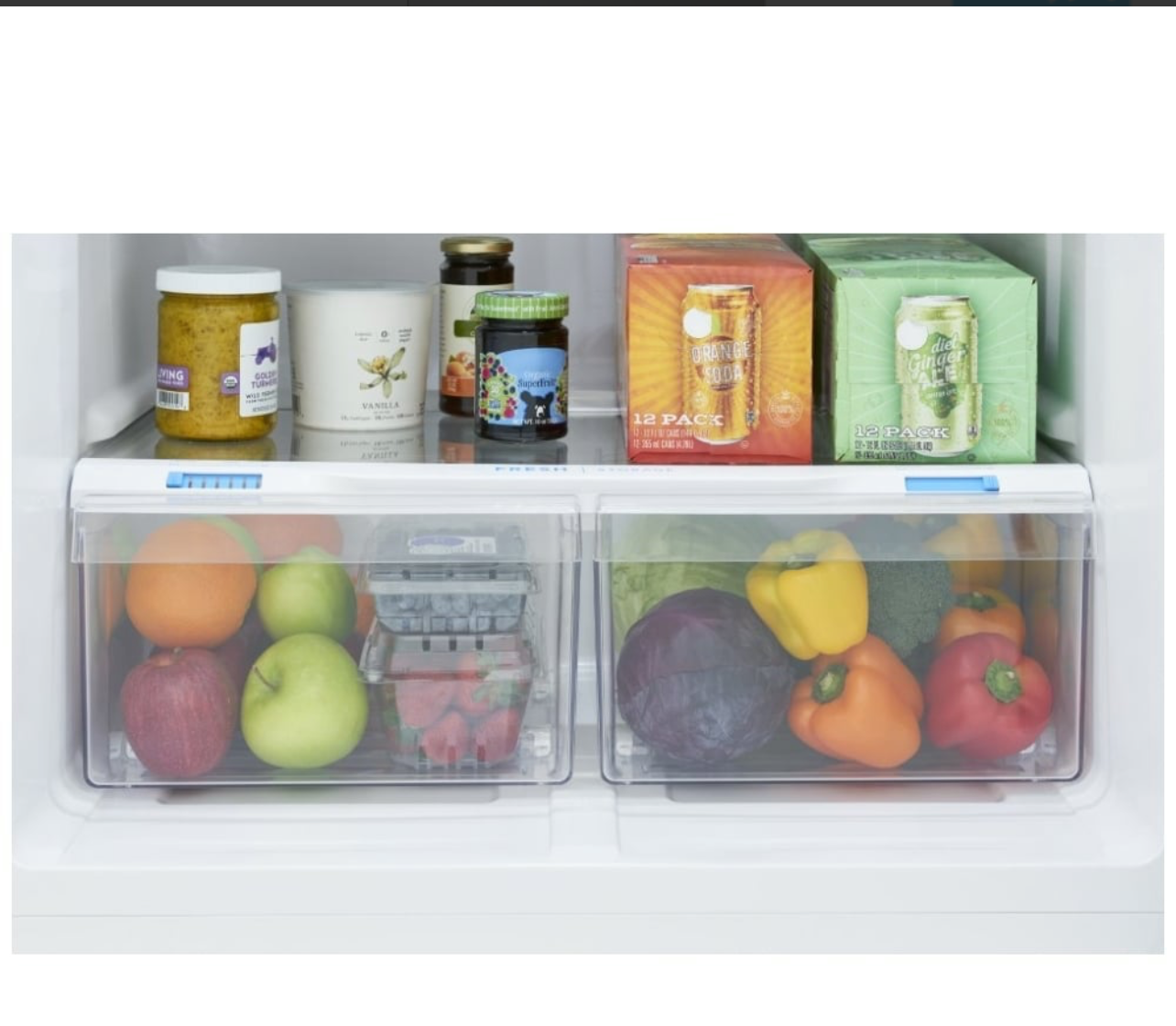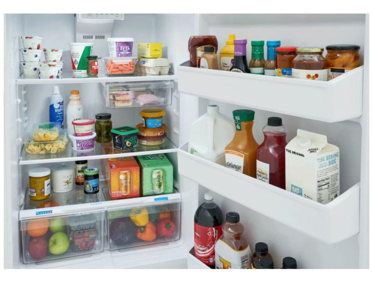 Frigidaire 18 cu. ft. top freezer refrigerator includes spacious interior storage options designed for busy families, including generous door bins, adjustable full-width glass shelving, and a sliding deli drawer. Our humidity-controlled crispers keep produce fresh for longer, allowing you to waste less and save money