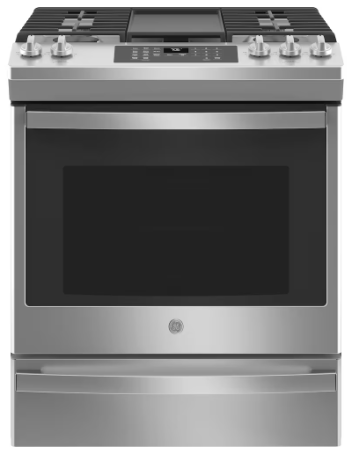 GE JCGS760SPSS Range, 30" Exterior Width, Gas Range, Self Clean, Gas Burners, Convection, 5 Burners, 5.6 cu. ft. Capacity, Storage Drawer, Air Fry, 1 Ovens, Wifi Enabled, 18K BTU, Front Controls, Stainless Steel colour