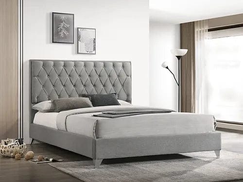 Grey Fabric Bed With Diamond Pattern Button Details and Chrome Legs