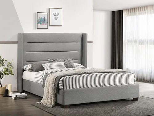 Grey Fabric Wing Bed with Horizontal Tufted Panels