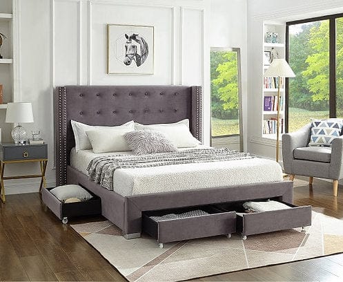 Grey Velvet Fabric Wing Bed with Nailhead Details and Chrome Legs.