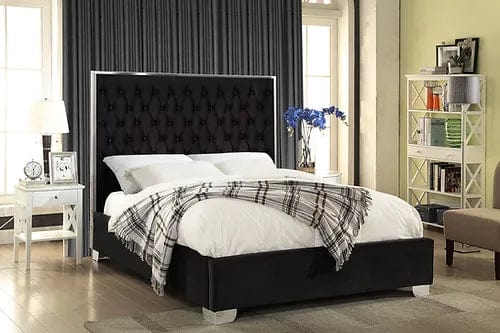Black Velvet Fabric with Deep Tufting and Chrome Trim on Headboard