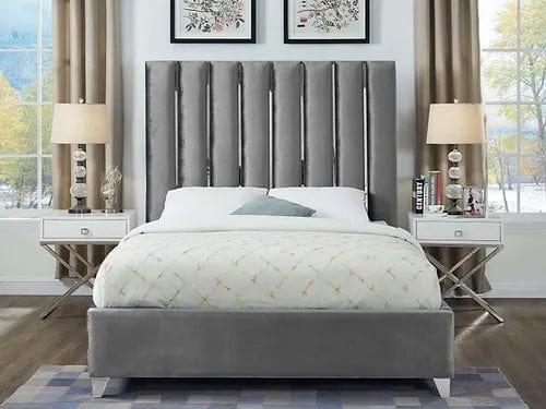The Chrome Channel Design Features Velvet Grey Fabric Upholstery for a Sleek, Glamorous Look
