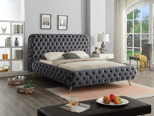 Grey Velvet Fabric Bed with Extra Deep Button Tufting and Sleek Chrome Leg