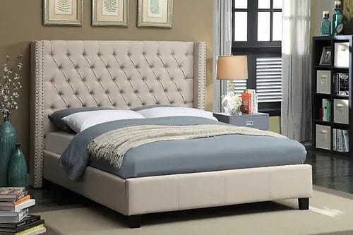 Beige Fabric Wing Bed with Deep Button Tufting and Nailhead Details