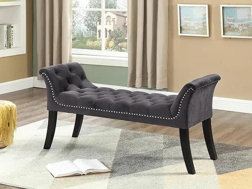 Grey Velvet Bench with Deep Tufting and Nail Head Details -