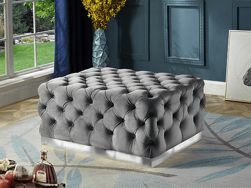 Grey Velvet Ottoman with Deep Tufting and Stainless Steel Base