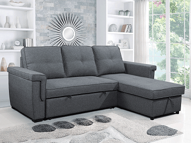 Sofabed Sectional With a Large Lift up Storage Compartment. Reversible Left or Right Hand Chaise. Grey Fabric With Piping Details.