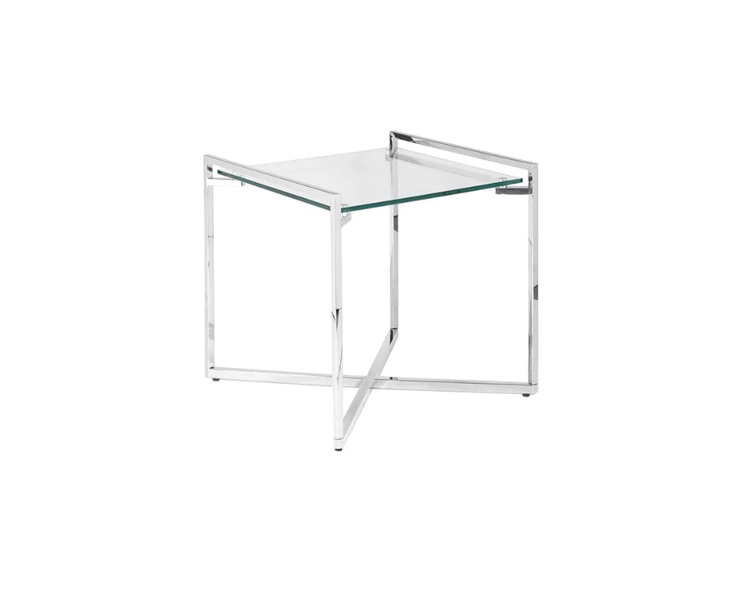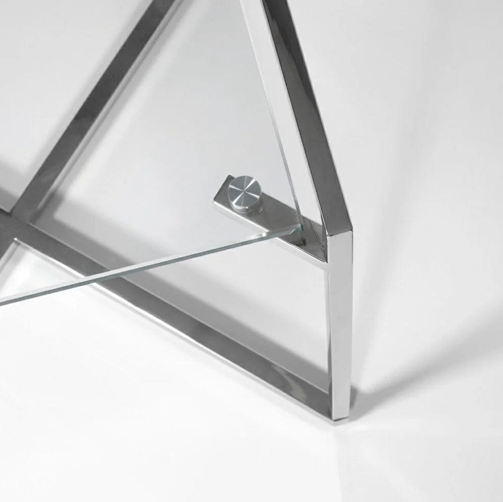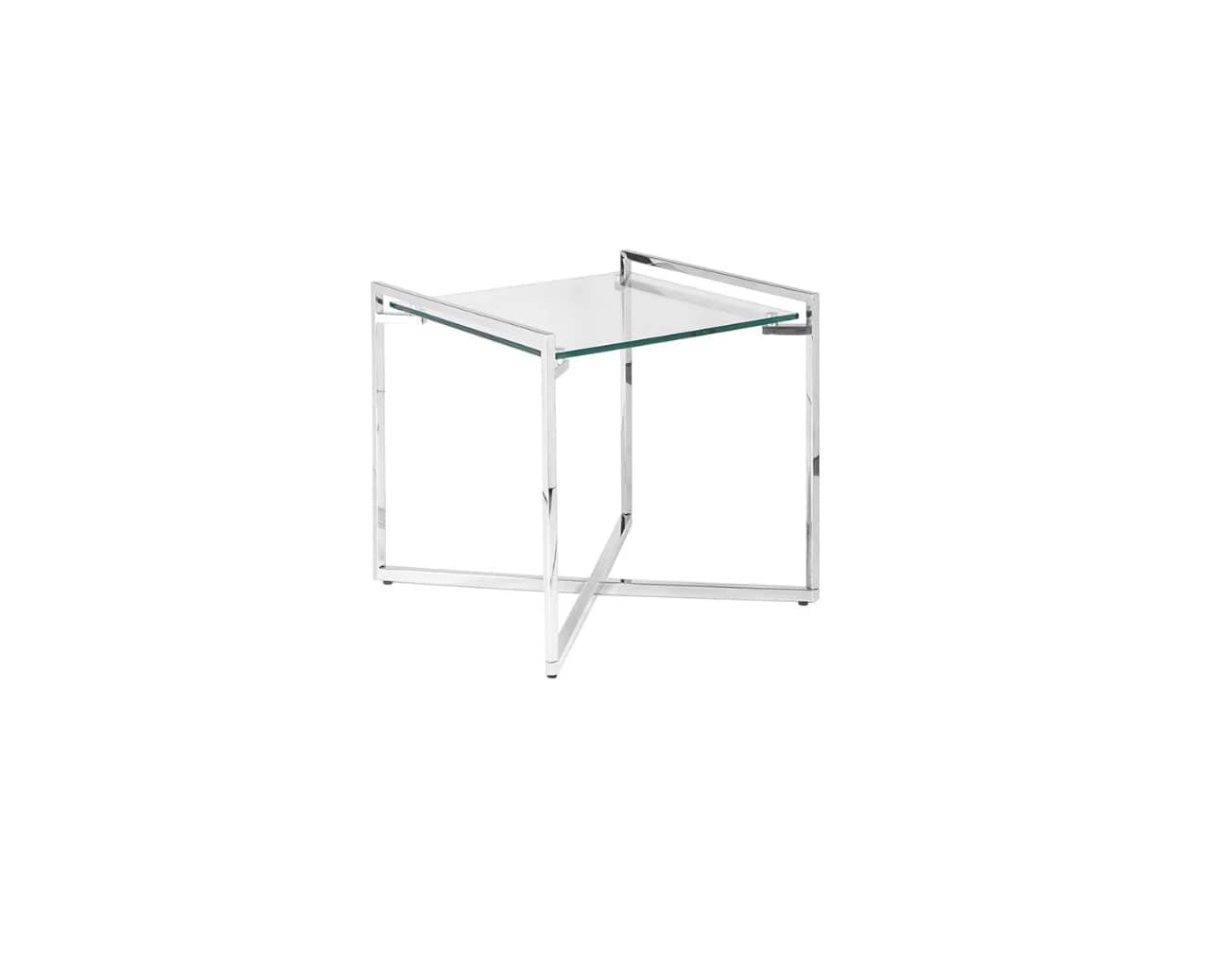 End table made of polished stainless steel with a frame on two sides and an x-shaped stretcher at floor level, for added support and accent. This end table is sleek and the tempered glass combination gives you an open look. Perfect for your contemporary living room or entryway or for any of your rooms decor.