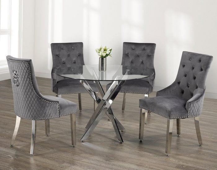 Chairs: Grey Velvet Dining Chair with Lion Knocker, Polished Chrome Frame, Diamond Studded back and Nail Head Details.