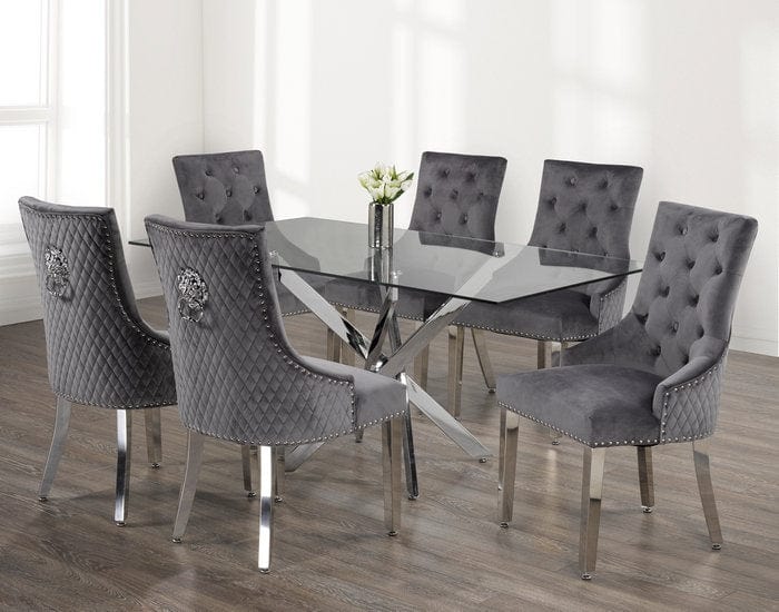 Chairs: Grey Velvet Dining Chair with Lion Knocker, Polished Chrome Frame, Diamond Studded back and Nail Head Details.