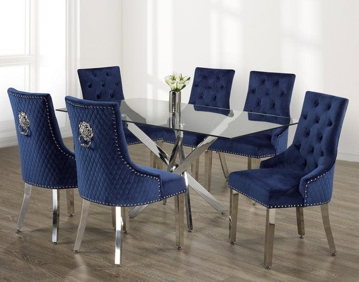 Chairs: Blue Velvet Dining Chair with Lion Knocker, Polished Chrome Frame, Diamond Studded back and Nail Head Details.