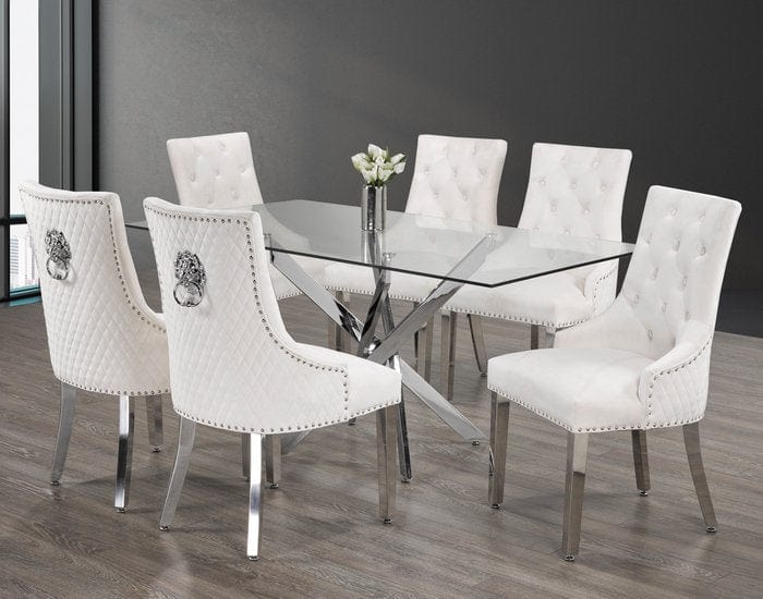 Chairs: Creme Velvet Dining Chair with Lion Knocker, Polished Chrome Frame, Diamond Studded back and Nail Head Details.